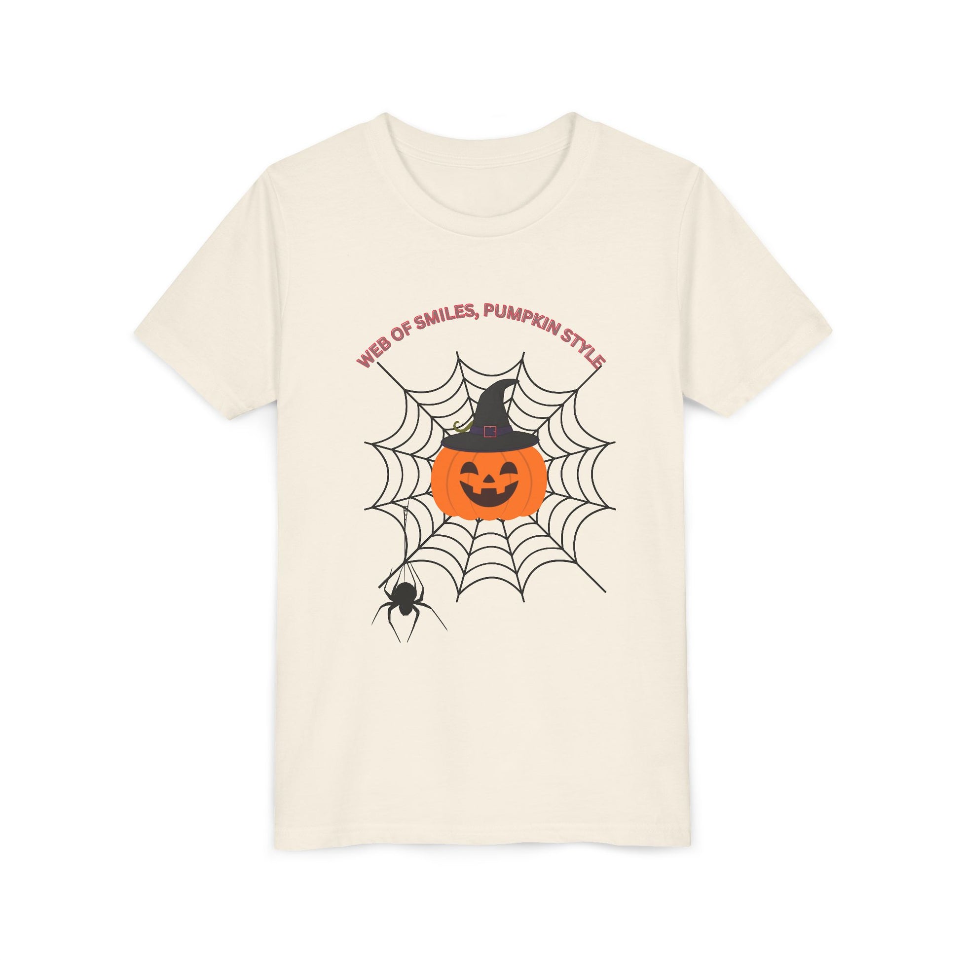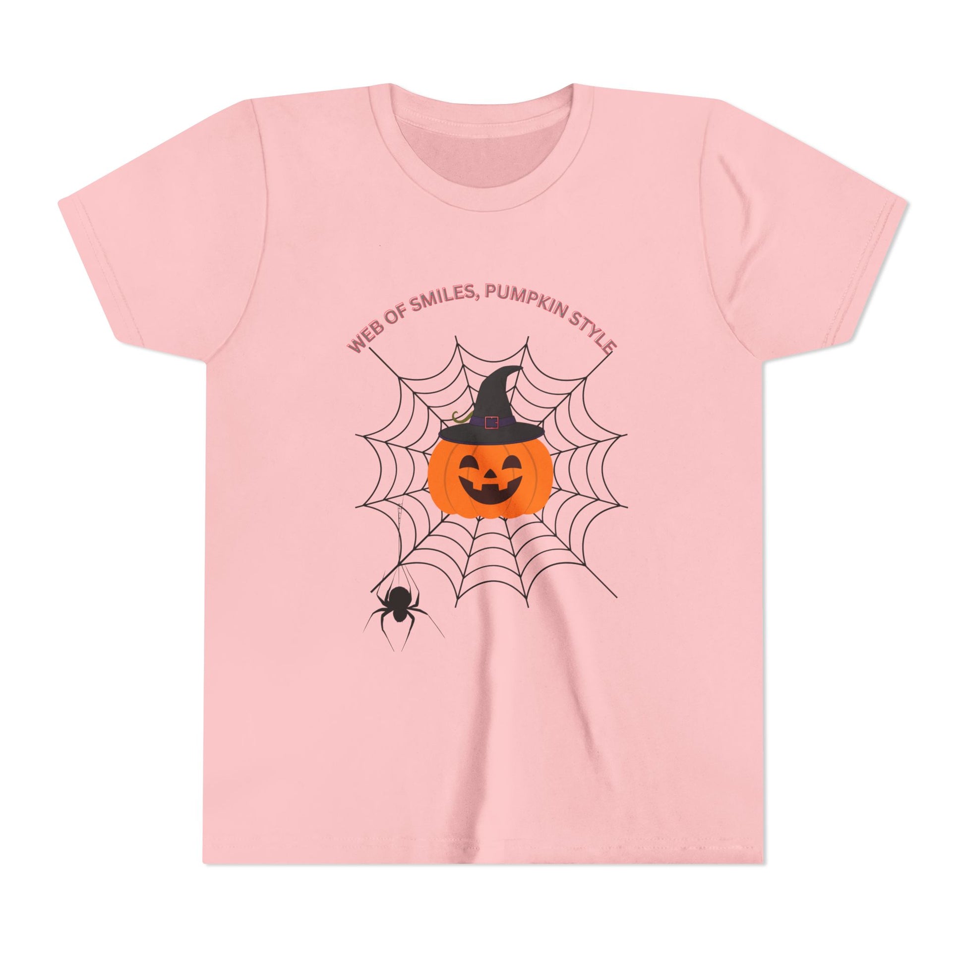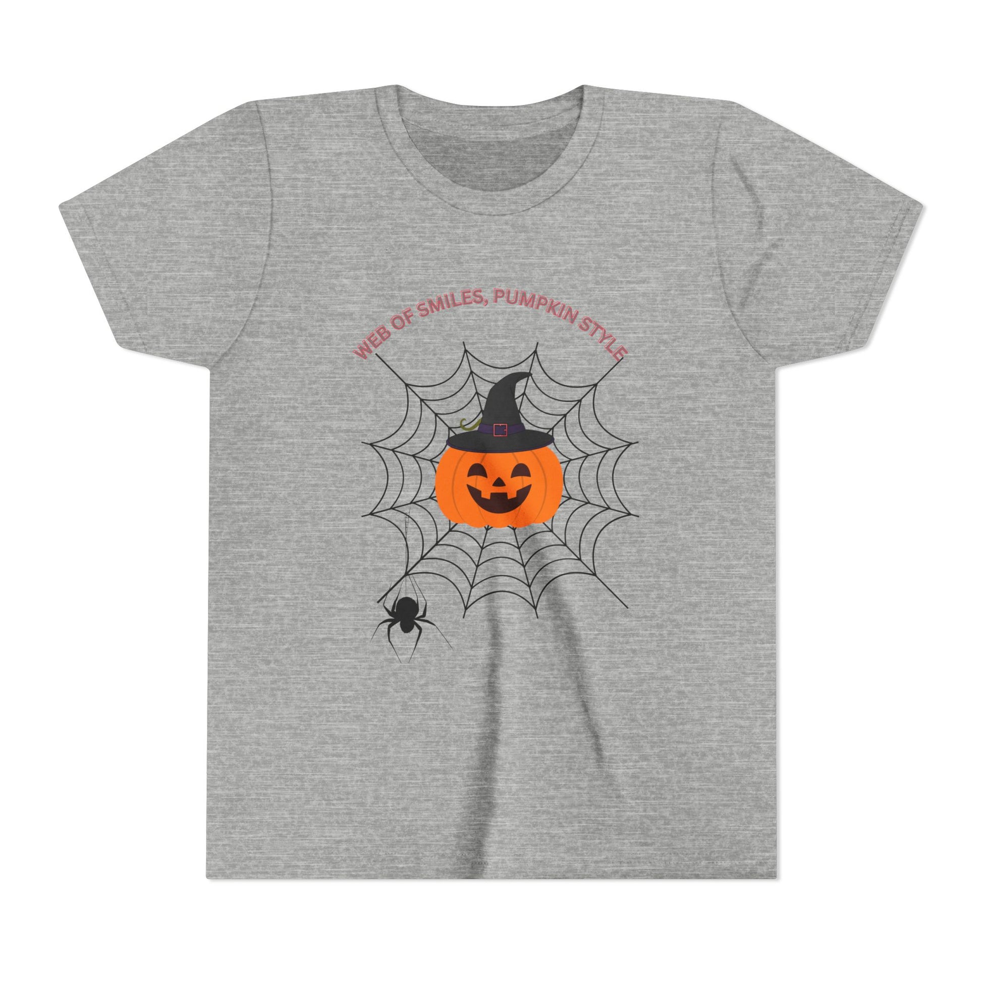 Halloween Themed Youth Short Sleeve Tee, Kids Tee, Pumpkin Shirt, Spider Web T-Shirt