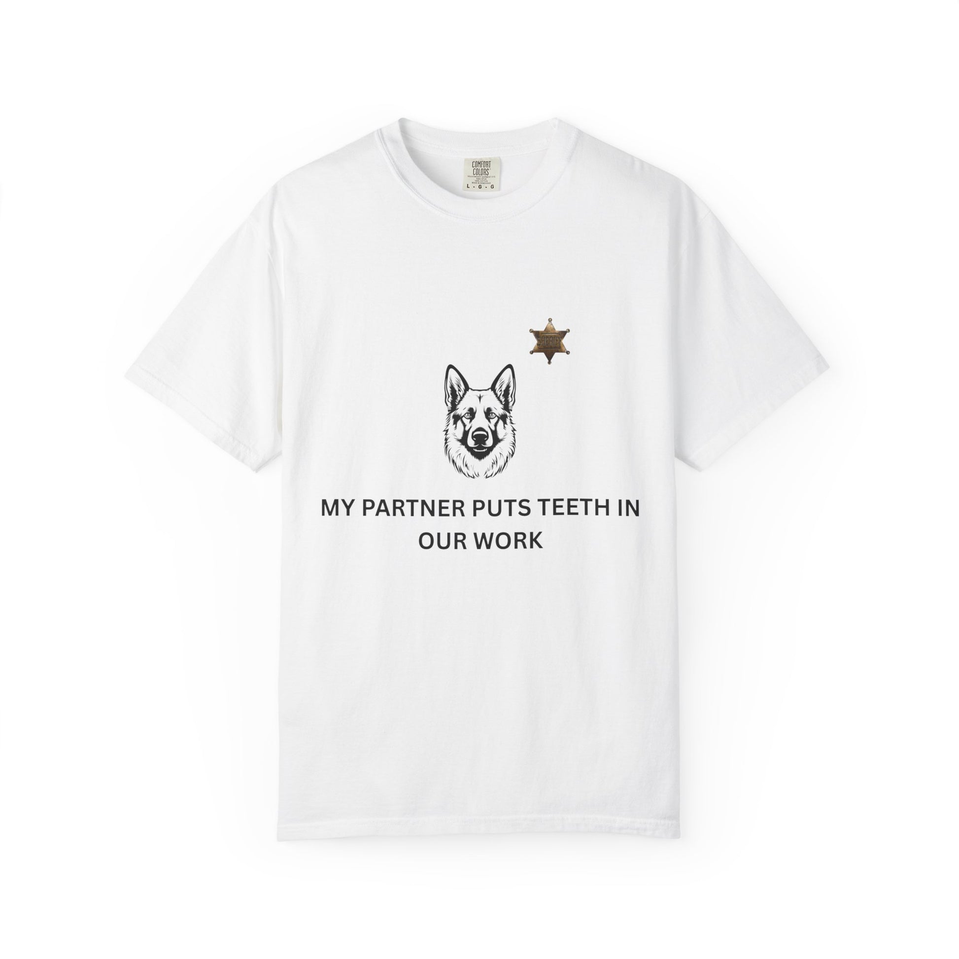 This unisex garment-dyed T-shirt features the phrase 'when necessary my k9 can put teeth into our work.' It has a relaxed fit and is made of 100% ring-spun US cotton, making it comfortable to wear. Perfect for dog lovers and those who appreciate a casual and unique design. Ideal for birthdays, holidays, and everyday wear.