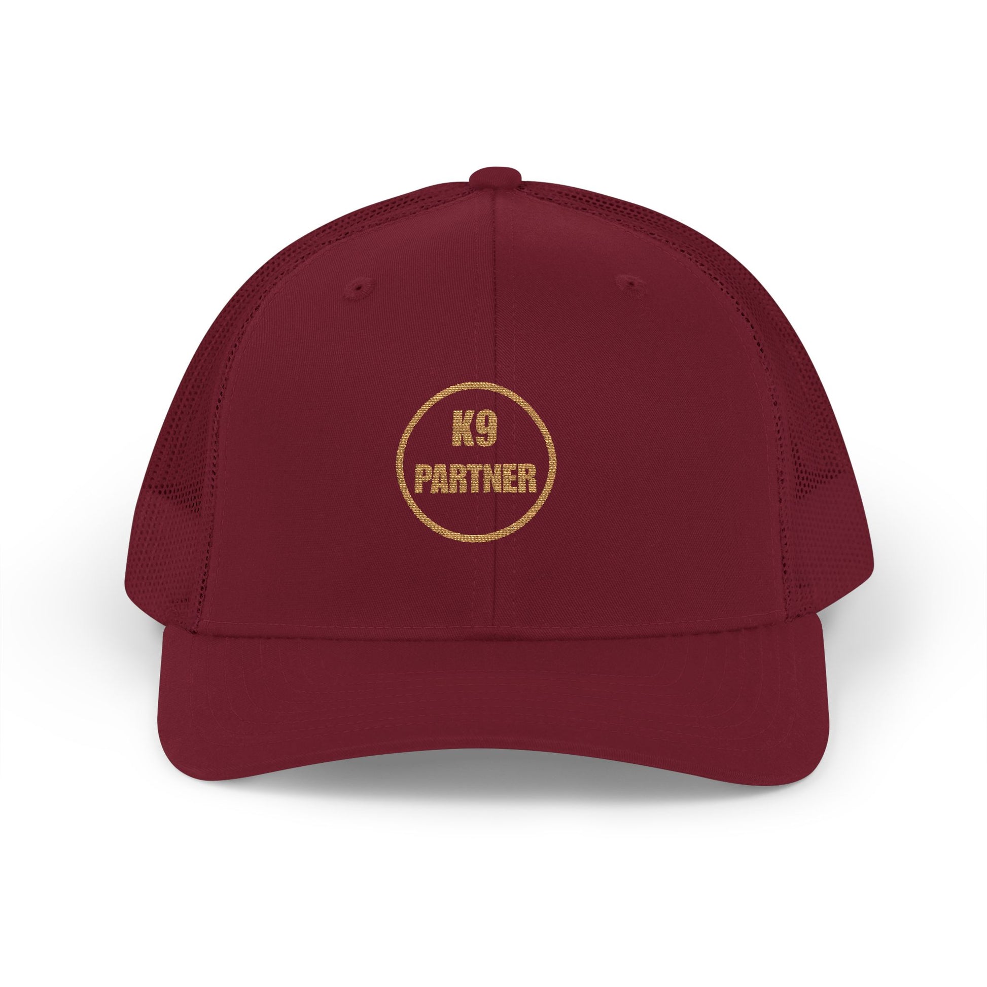 K9 Partner Snapback Trucker Cap for k9 handlers, trainers and dog lovers. This structured and mid-profile cap with a curved visor and adjustable snap closure is perfect for anyone who loves dogs and wants to show off their passion. It is relevant for dog training events, K9 competitions, and dog lovers' gatherings.