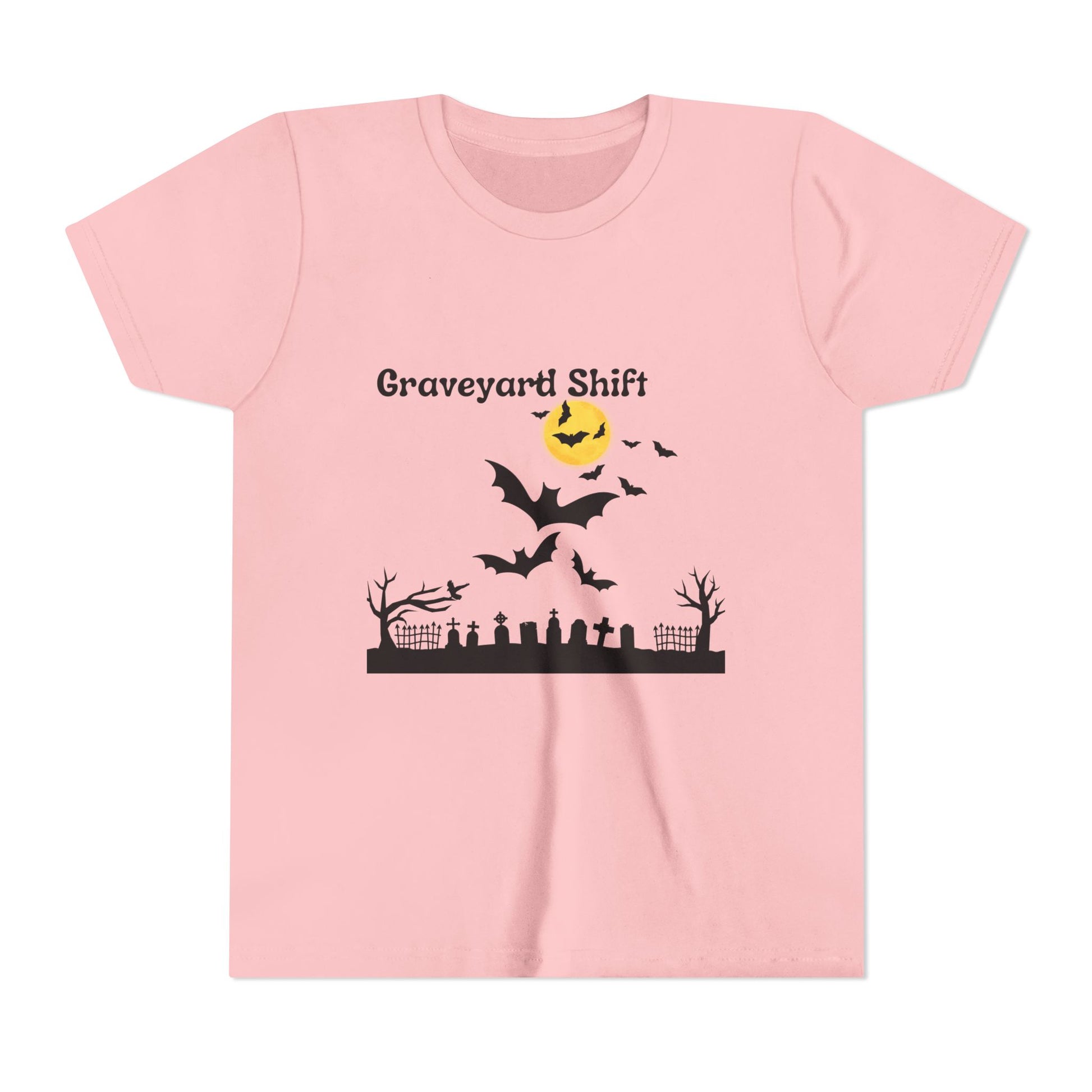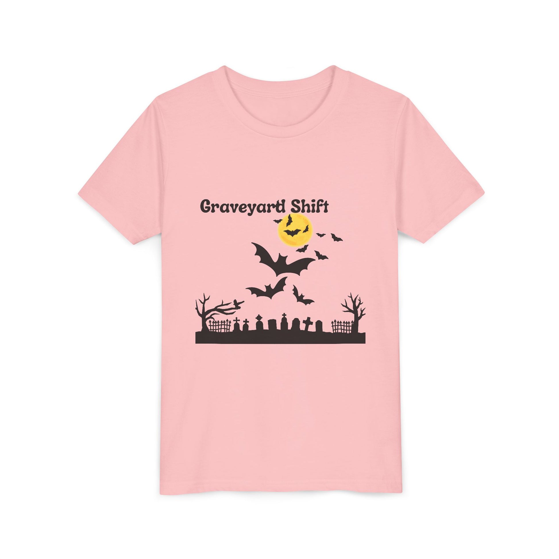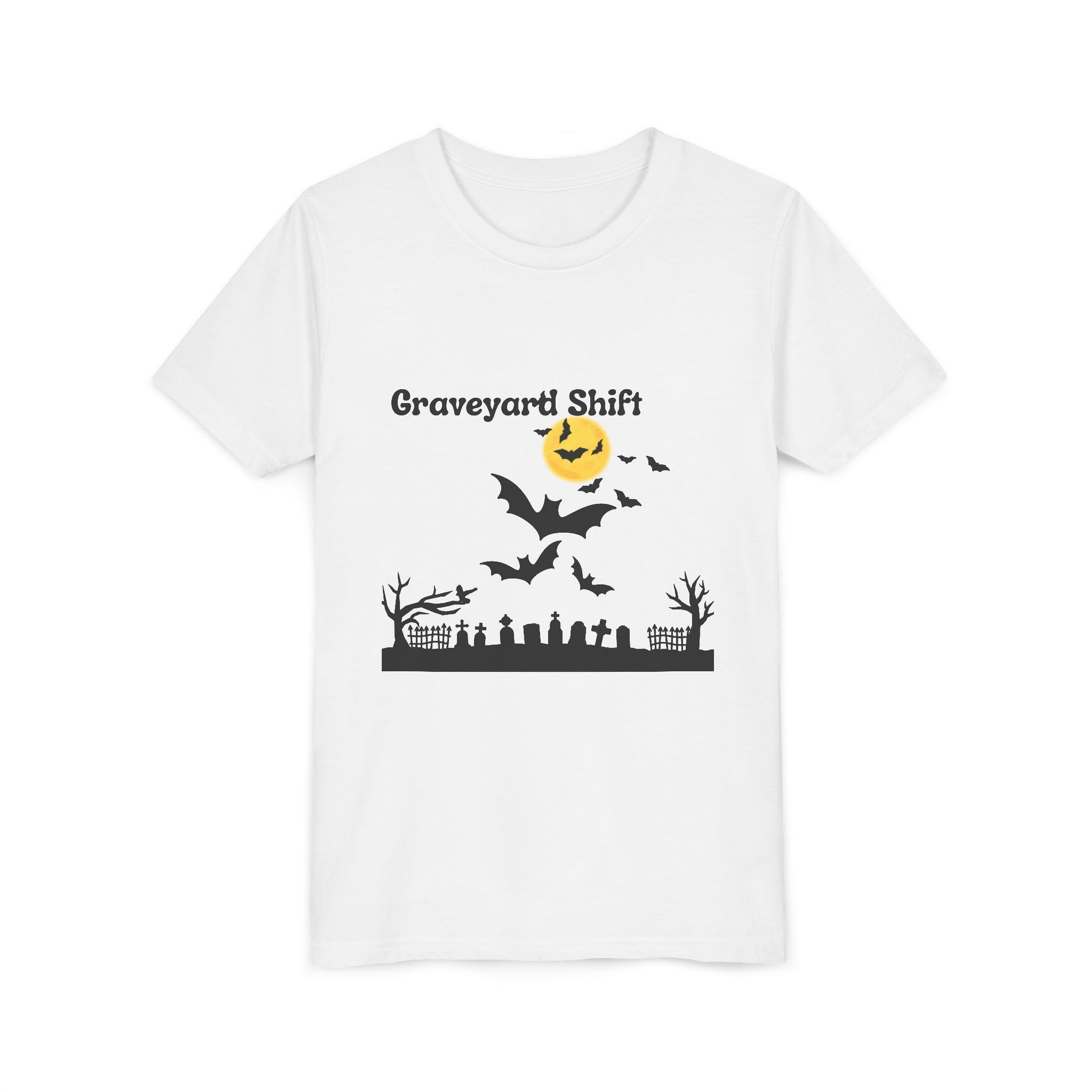 A spooky Halloween youth tee featuring a design of a graveyard scene. Perfect for kids and teenagers who love Halloween and enjoy spooky vibes. Ideal for Halloween parties, trick-or-treating, and other Halloween events.