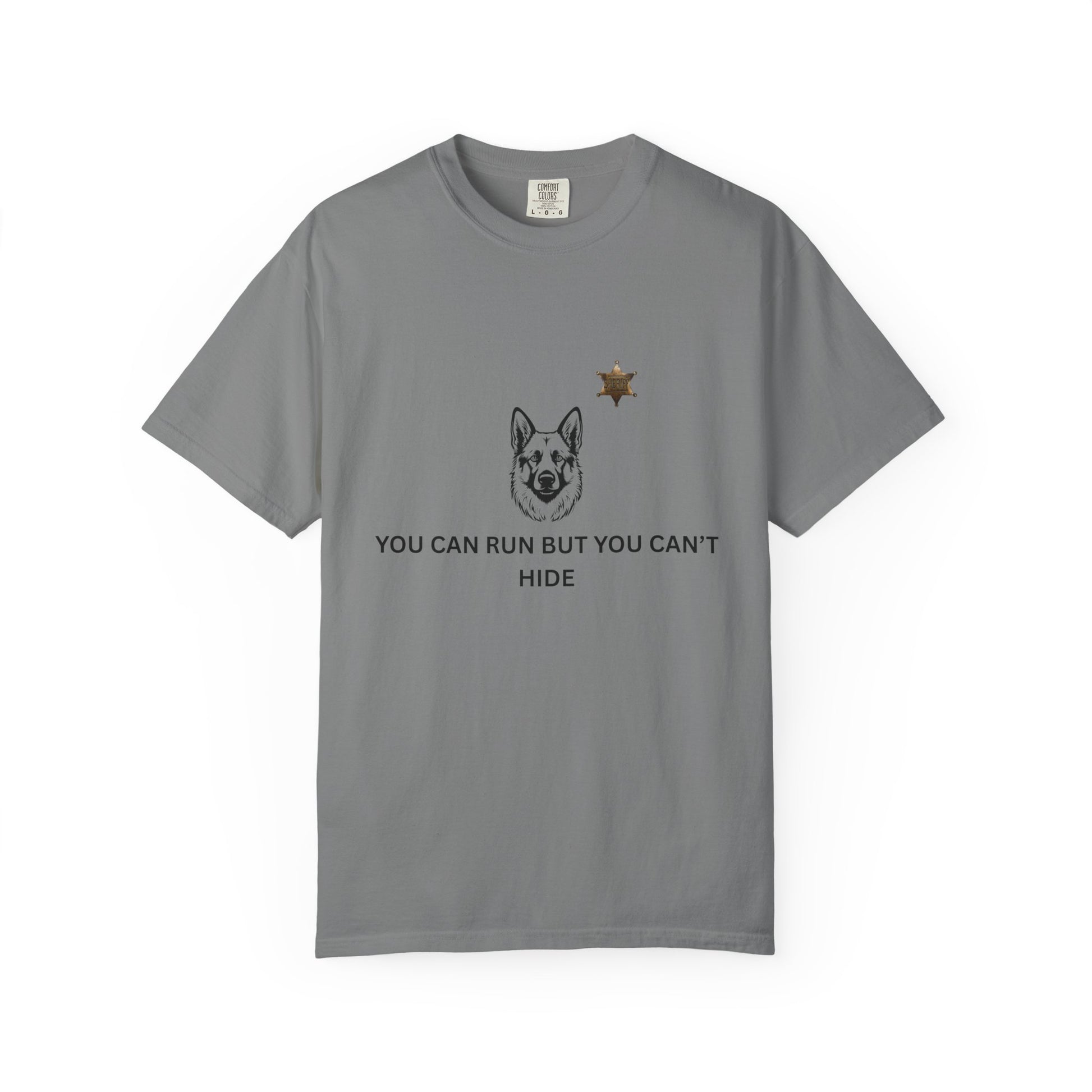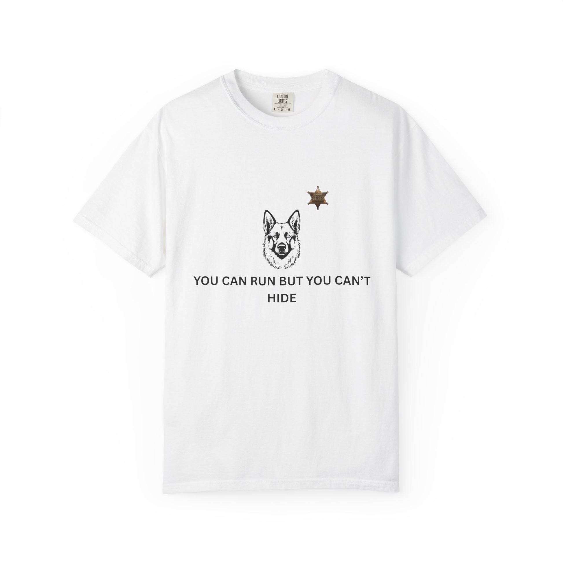 Introducing a versatile Unisex Garment-Dyed T-Shirt that combines comfort with bold personality. Featuring the powerful “You Can Run But You Cannot Hide” K9 design, this shirt pays tribute to the unmatched spirit of German Shepherds and working dogs. With its relaxed fit and garment-dyed softness, it’s perfect for any casual occasion—whether you’re lounging at home, meeting friends for coffee, or enjoying a day out.